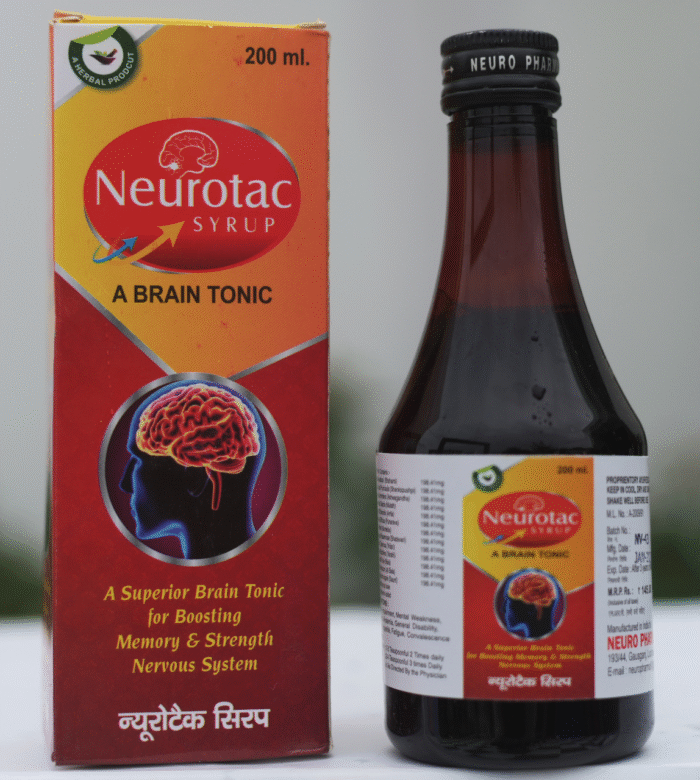 Neurotac Brain Tonic is a powerful Ayurvedic formulation enriched with brain-boosting herbs like Brahmi, Shankhpushpi, Ashwagandha, Mandukaparni, and Vacha, known for their nootropic and adaptogenic properties. This tonic supports memory retention, mental alertness, and overall brain wellness.