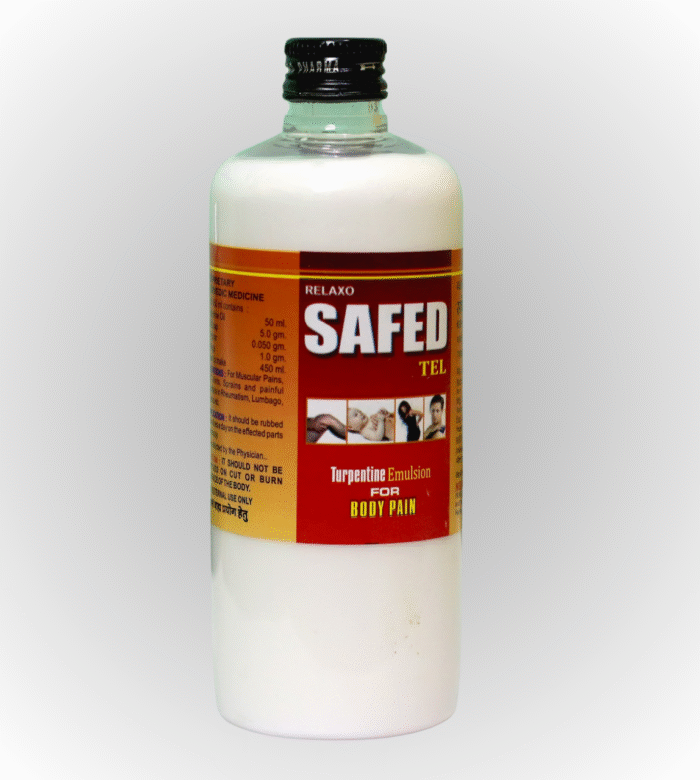 RELAXO Safed Tel is based on a Terpentine Emulsion, which typically means it contains turpentine oil emulsified in a base. Other common ingredients found in such pain relief oils, though not explicitly visible on this label, may include: